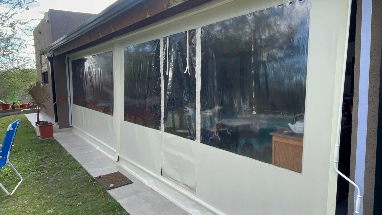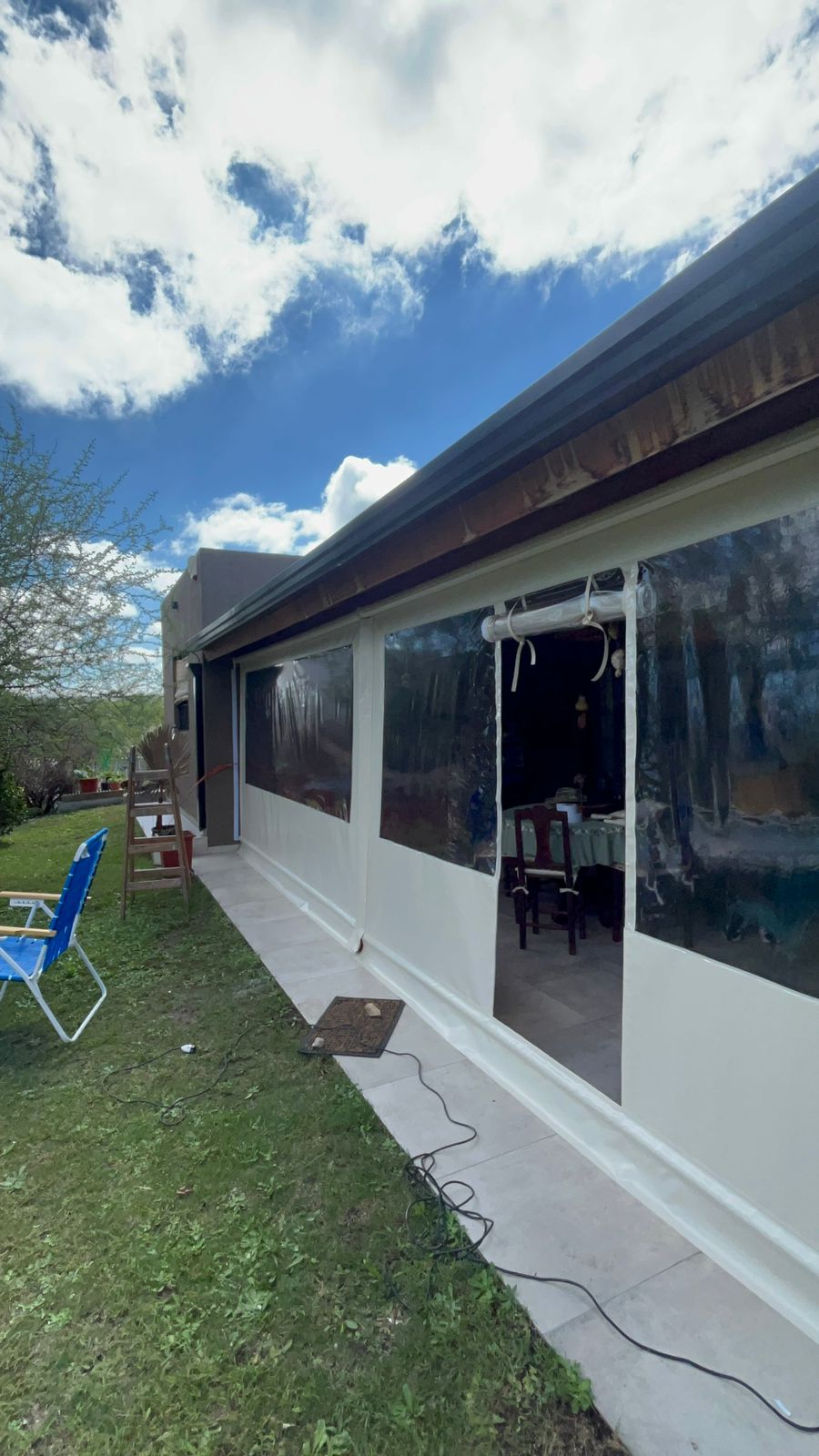 Este toldo vertical enrollable está confeccionado en lona PVC de alta resistencia, ideal para proteger espacios exteriores como galerías, quinchos o patios sin perder luminosidad ni visibilidad. Su ventana central de material cristal transparente permite el ingreso de luz natural y una vista clara del exterior, manteniendo el ambiente cerrado y protegido del viento, la lluvia o el polvo.